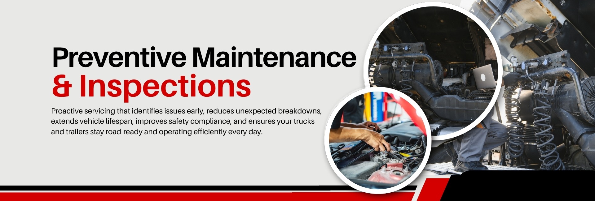Regular preventive maintenance and inspections maximize fleet reliability, safety, and performance while minimizing costly breakdowns.